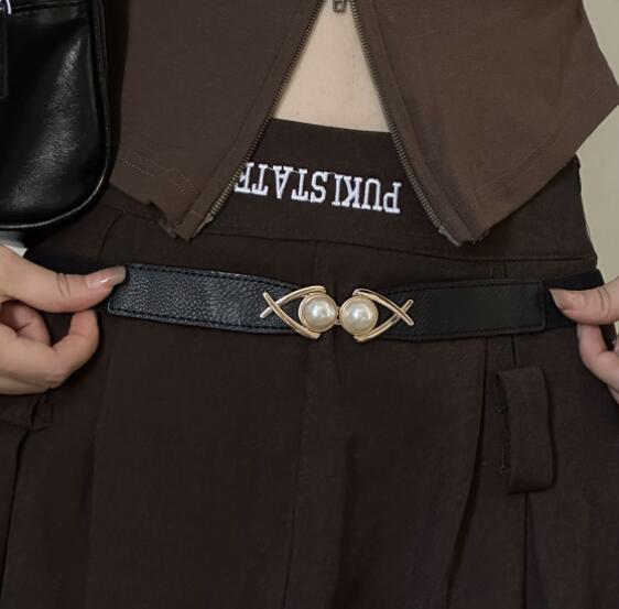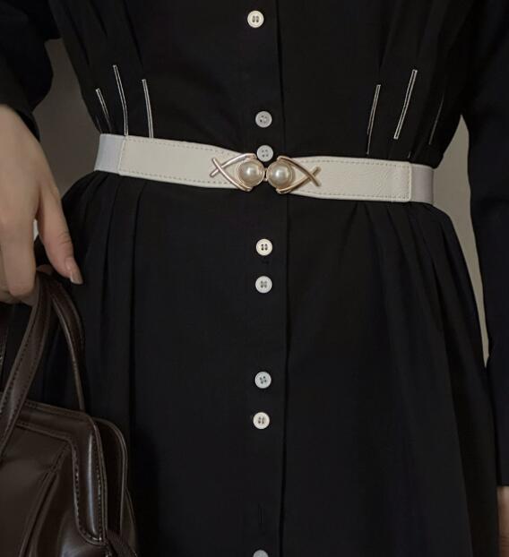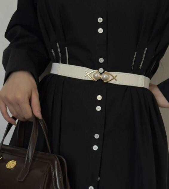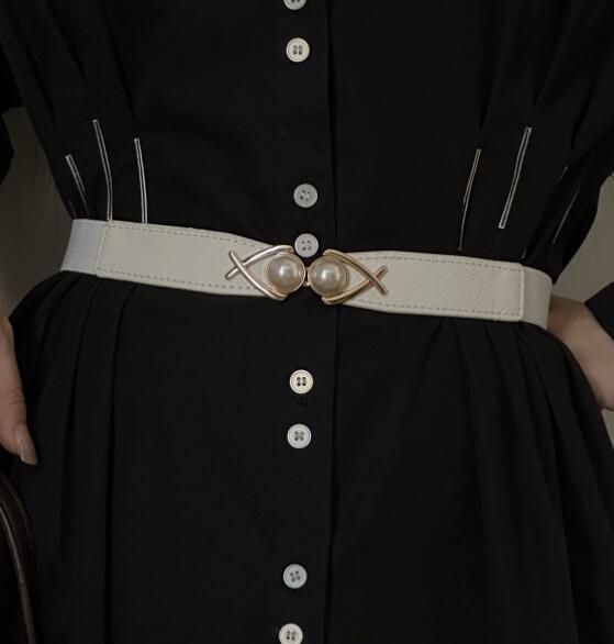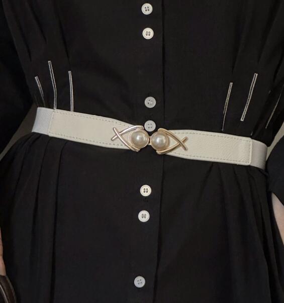 パンクファッションにエレガントなアクセントを加える個性的なベルト。 白いレザー素材にパール装飾のバックルが特徴的で、黒いワンピースとのコントラストが美しい。 ウエストマークでスタイルアップ効果も抜群です。