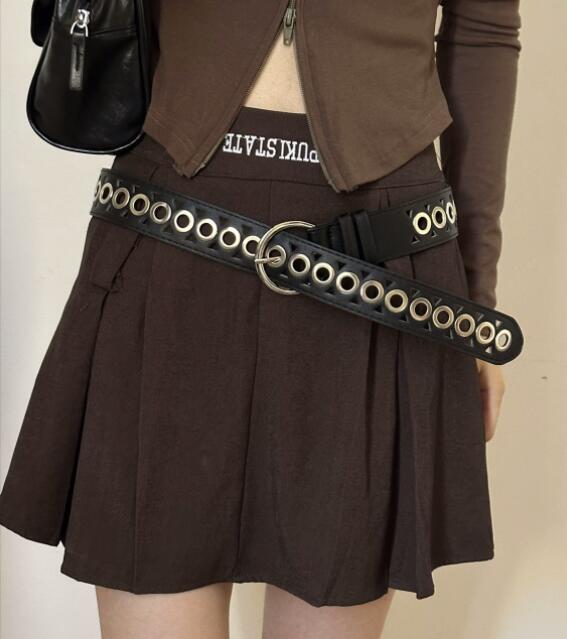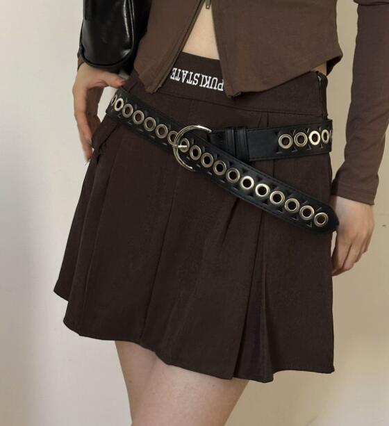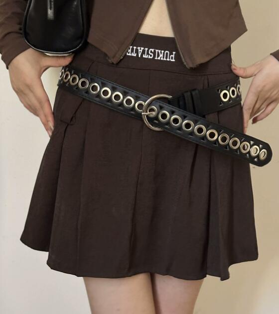 個性的なハトメ装飾が施されたフェイクレザーベルトです。 大小のハトメがベルト全体に配置され、存在感抜群のデザイン。 パンクファッションのアクセントとして最適で、 スカートやパンツと合わせてエッジの効いたスタイリングが楽しめます。