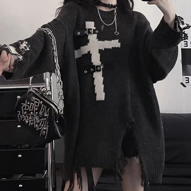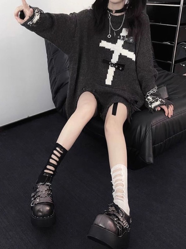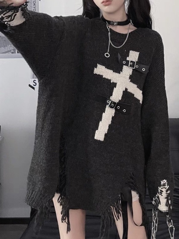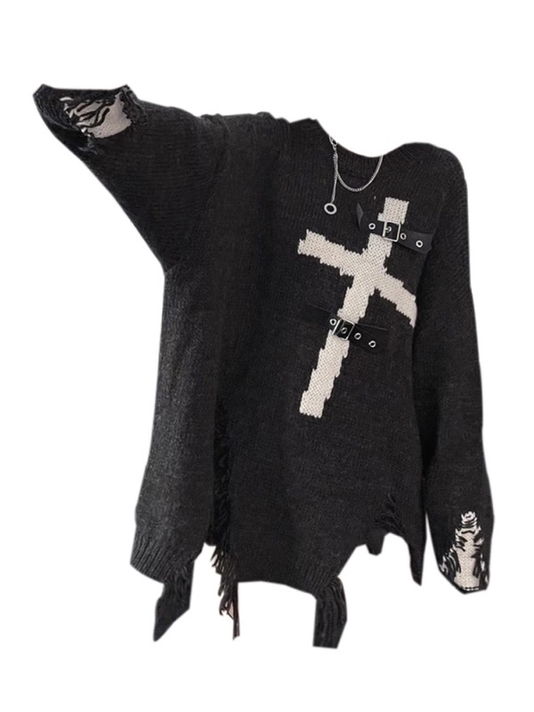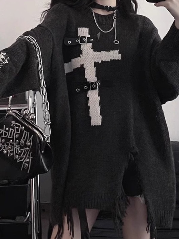 個性的な十字架モチーフとダメージ加工が印象的なニットセーターです。 快適な着心地とパンクファッションらしい反逆的なデザインが特徴で、日常から特別なイベントまで幅広く活躍します。 洗練された黒基調のデザインは、パンクスタイルを格上げしあなたの個性を際立たせます。
