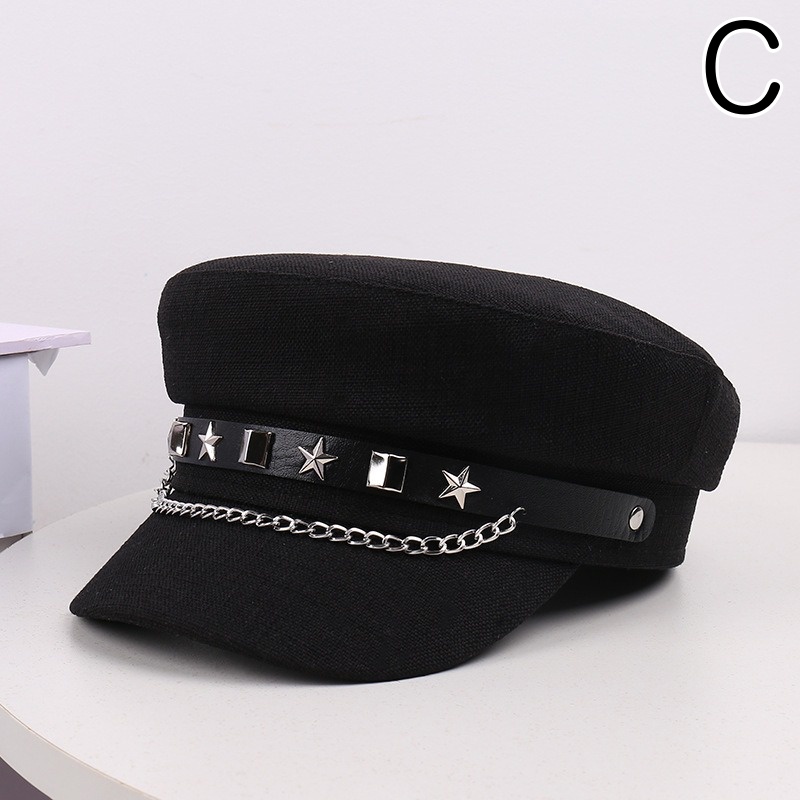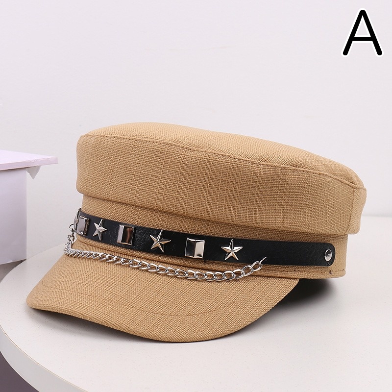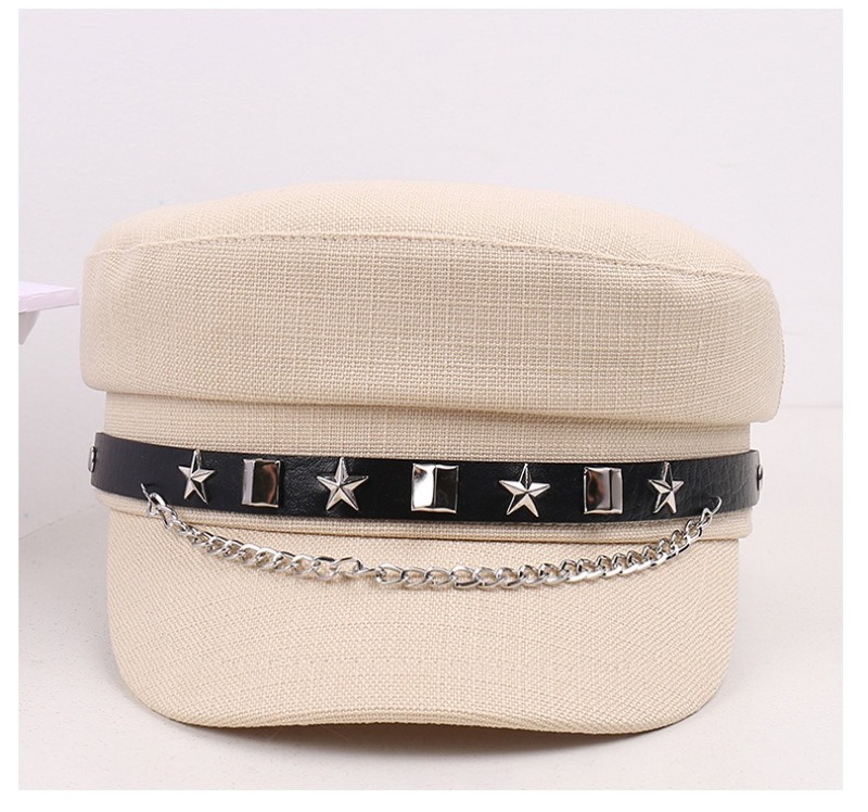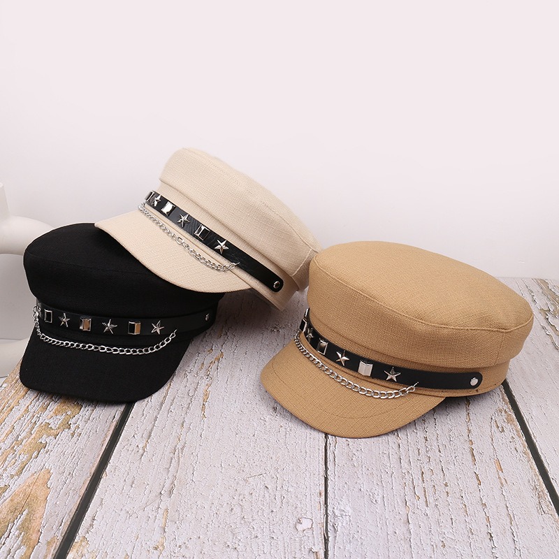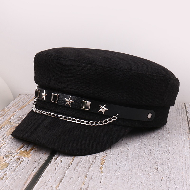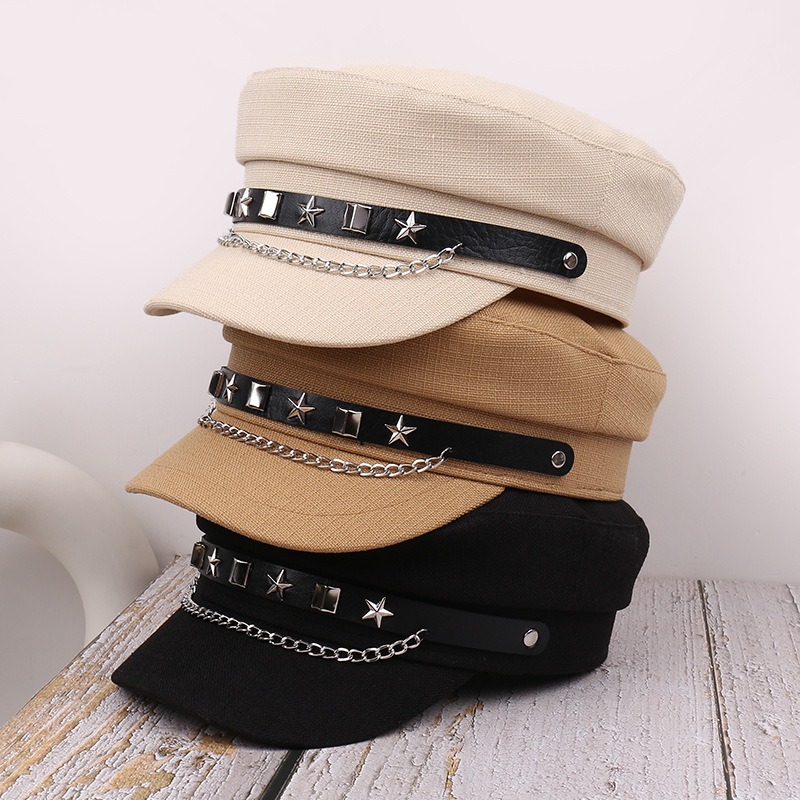 星型スタッズとチェーンが印象的なパンクファッション帽子。 ブラックとベージュの2色展開で、個性的なスタイルを演出。 あなたのライフスタイルを豊かにする魅力的な軍帽デザインです。