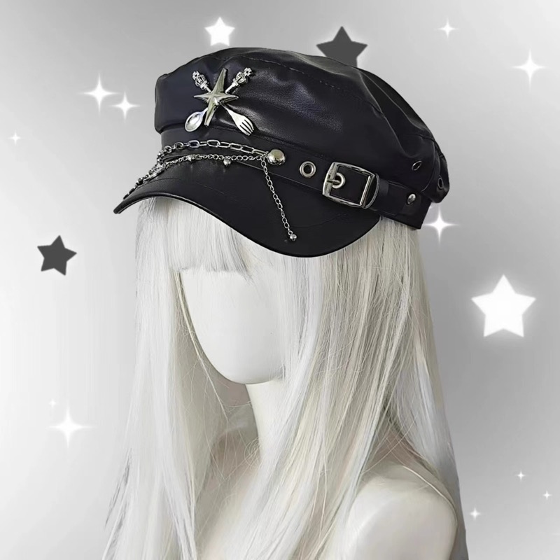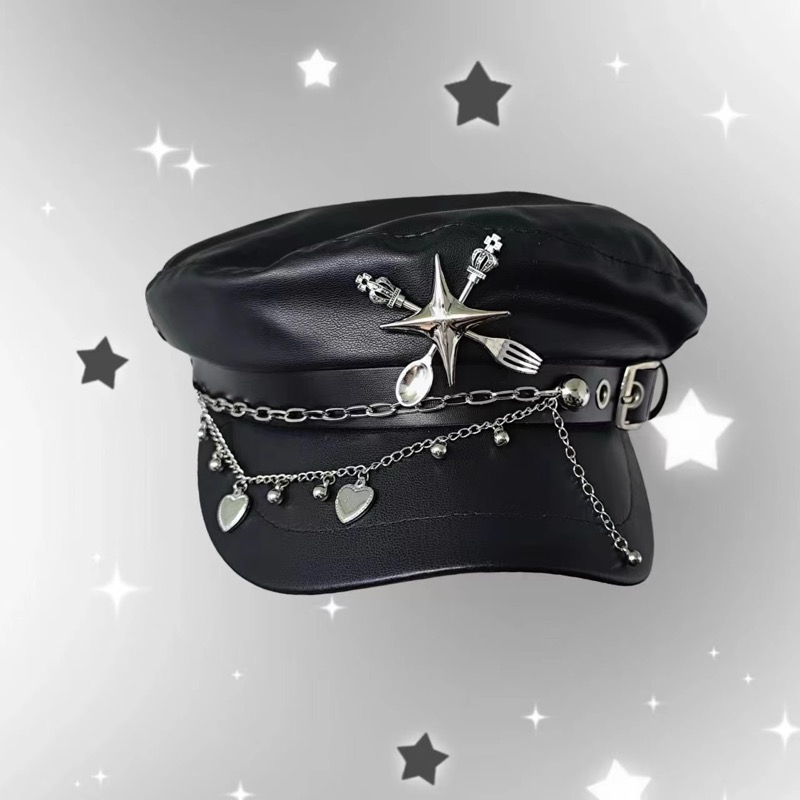 合成皮革素材にスタッズと星型装飾が施されたベレー帽で、チェーンとバックルがアクセントになっています。