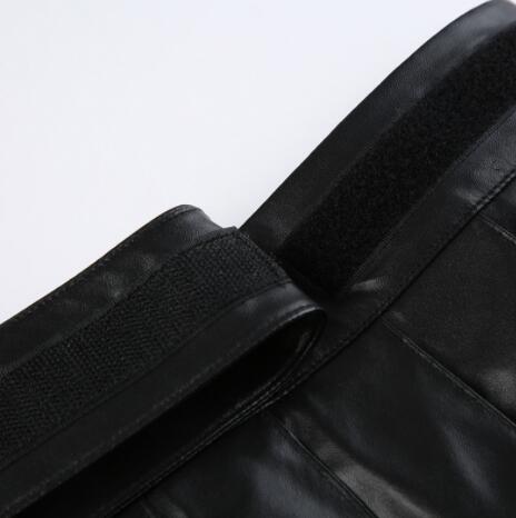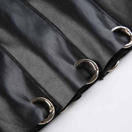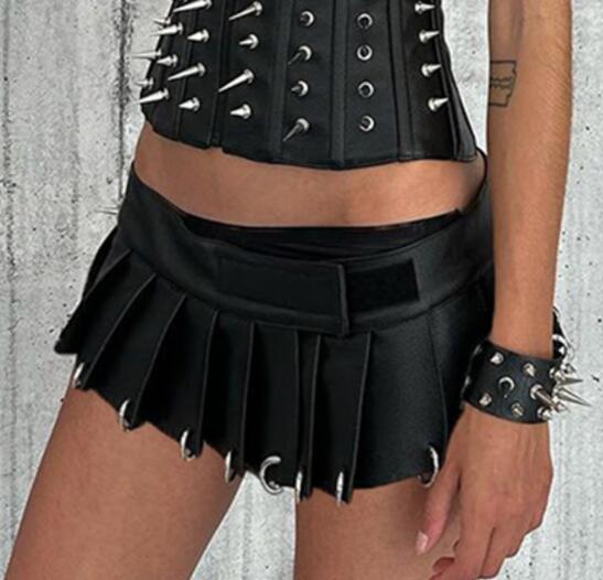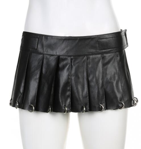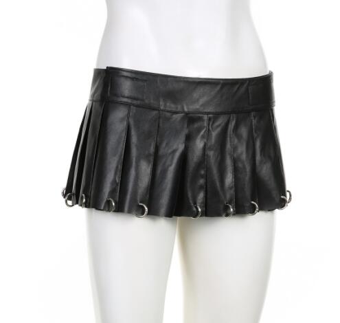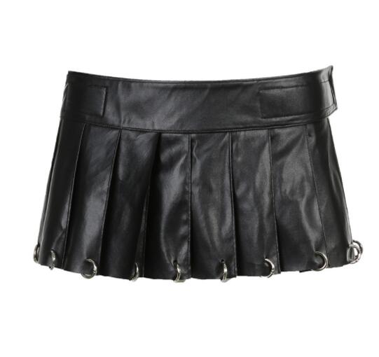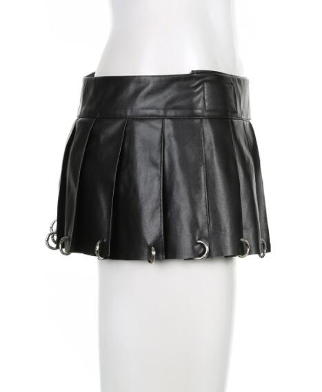 黒のレザー調素材にプリーツデザインが映える個性的なミニスカート。