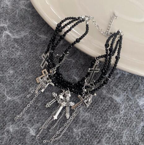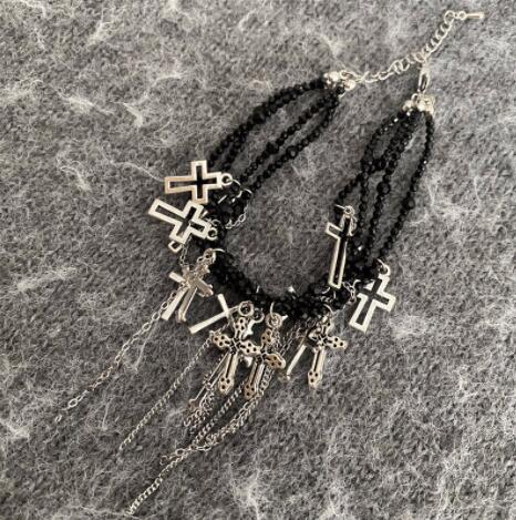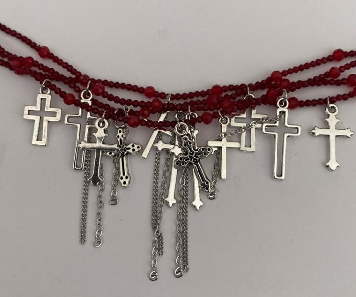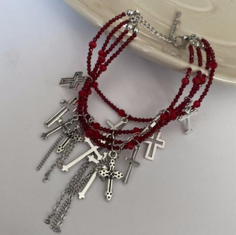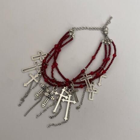 パンクファッションの定番アイテム、十字架モチーフが印象的な多連ブレスレット。 赤と黒の2色展開で、重厚感のあるチェーンと十字架チャームが組み合わさった個性的なデザイン。 ロック系やゴシック系のコーディネートにぴったりのアクセサリーです。