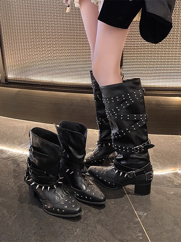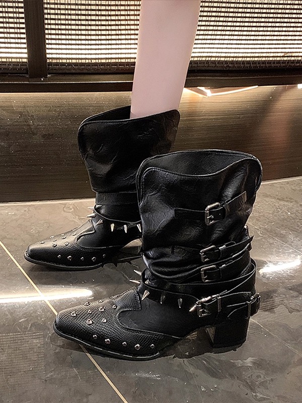 パンクファッションに欠かせないスタッズとベルトが印象的なミドル丈ブーツです。