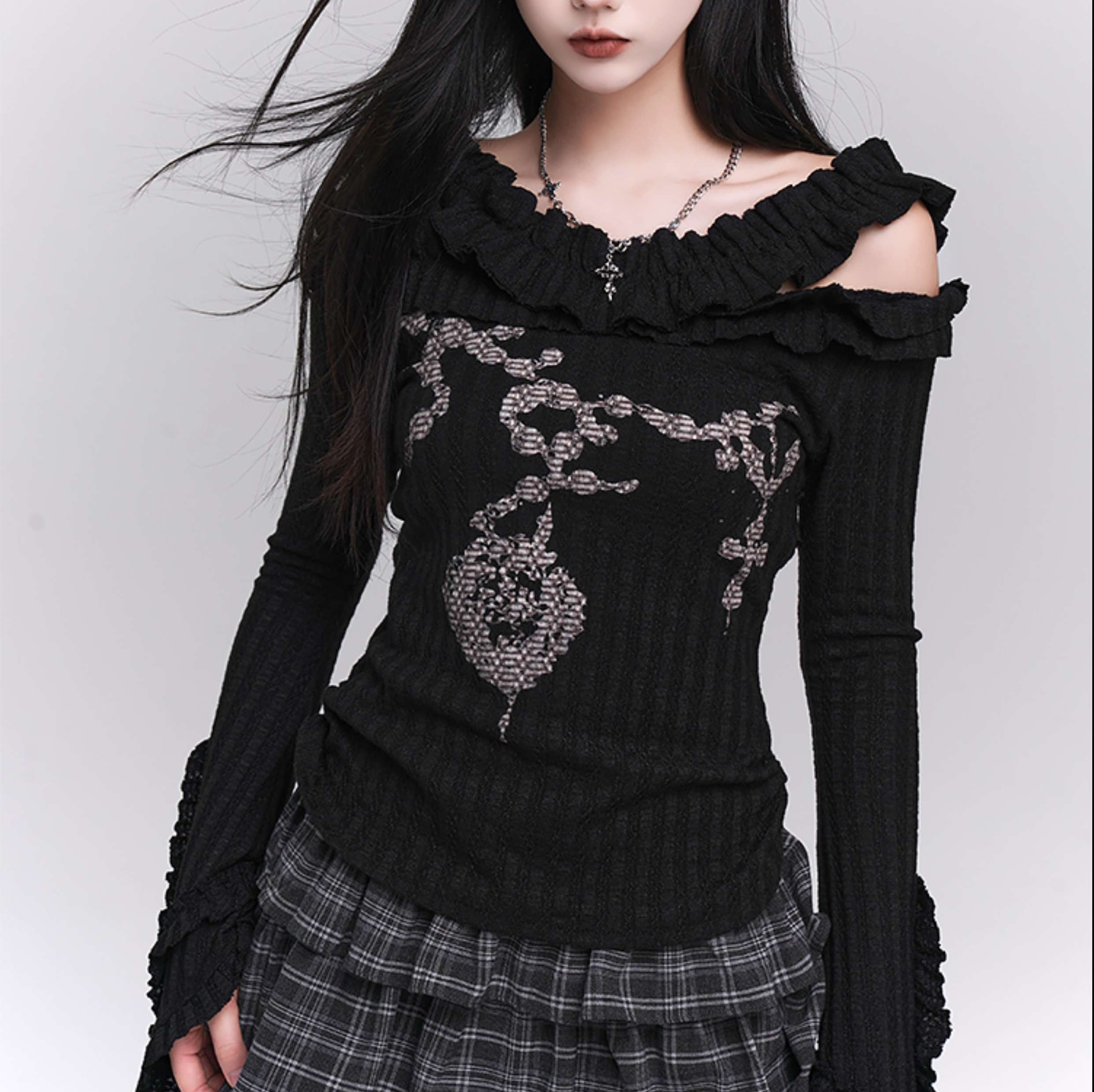 肩を大胆に露出させたニットトップス。胸元の装飾的な模様や袖口のフリルが、ゴシックなテイストを引き立てる。裾のティアードデザインが、パンクファッションの個性を際立たせ、他にはないスタイルを実現。どんなアイテムとも組み合わせやすく、ワードローブに欠かせない一着。新しい自分を発見するチャンスを提供するトップス。